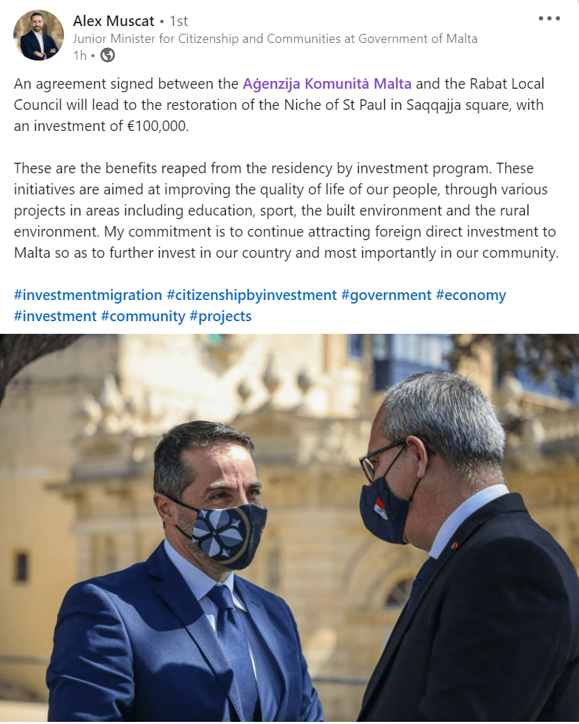 The post goes on to say, “'[t]hese are the benefits reaped from the residency by investment program. These initiatives are aimed at improving the quality of life of our people, through various projects in areas including education, sport, the built environment and the rural environment. My commitment is to continue attracting foreign direct investment to Malta so as to further invest in our country and most importantly in our community.”